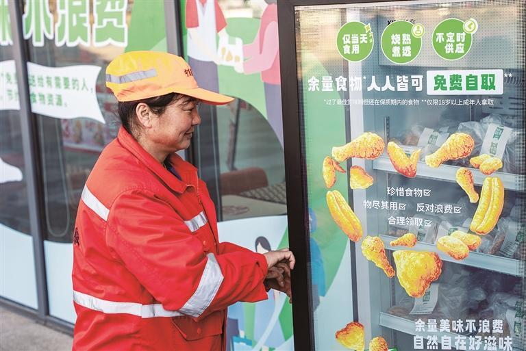 環(huán)衛(wèi)工人從“食物驛站”專(zhuān)屬冰柜中領(lǐng)取“余量食物”禮包。