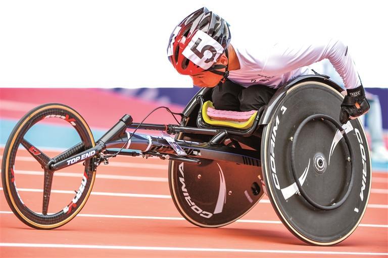 寧夏選手馬寧參加男子競速輪椅比賽。