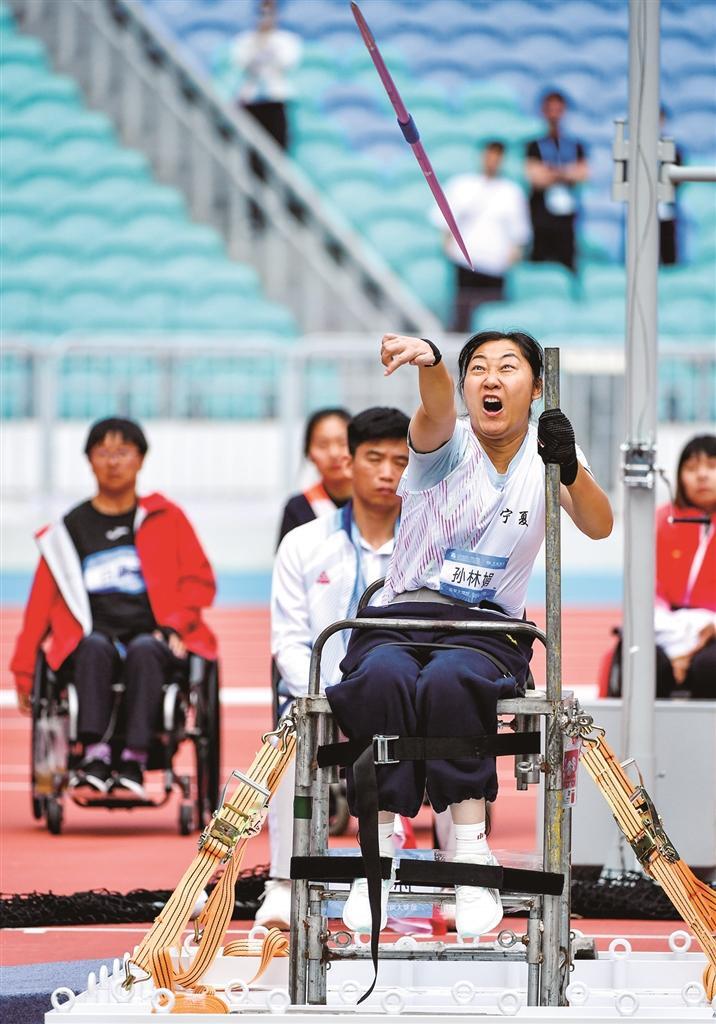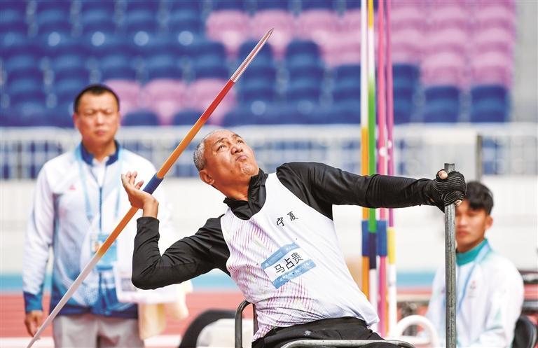 12月9日,在男子鉛球F52級賽場上,來自固原市的馬占貴坐在特制投擲架上,后傾蓄力、奮力一擲的連貫動作贏得觀眾熱烈掌聲。他以6.6米的成績?yōu)閷幭拇韴F(tuán)斬獲田徑項(xiàng)目首金。兩天后,他又在標(biāo)槍F52級、鐵餅F52級贏得兩枚金牌,加冕“三冠王”。