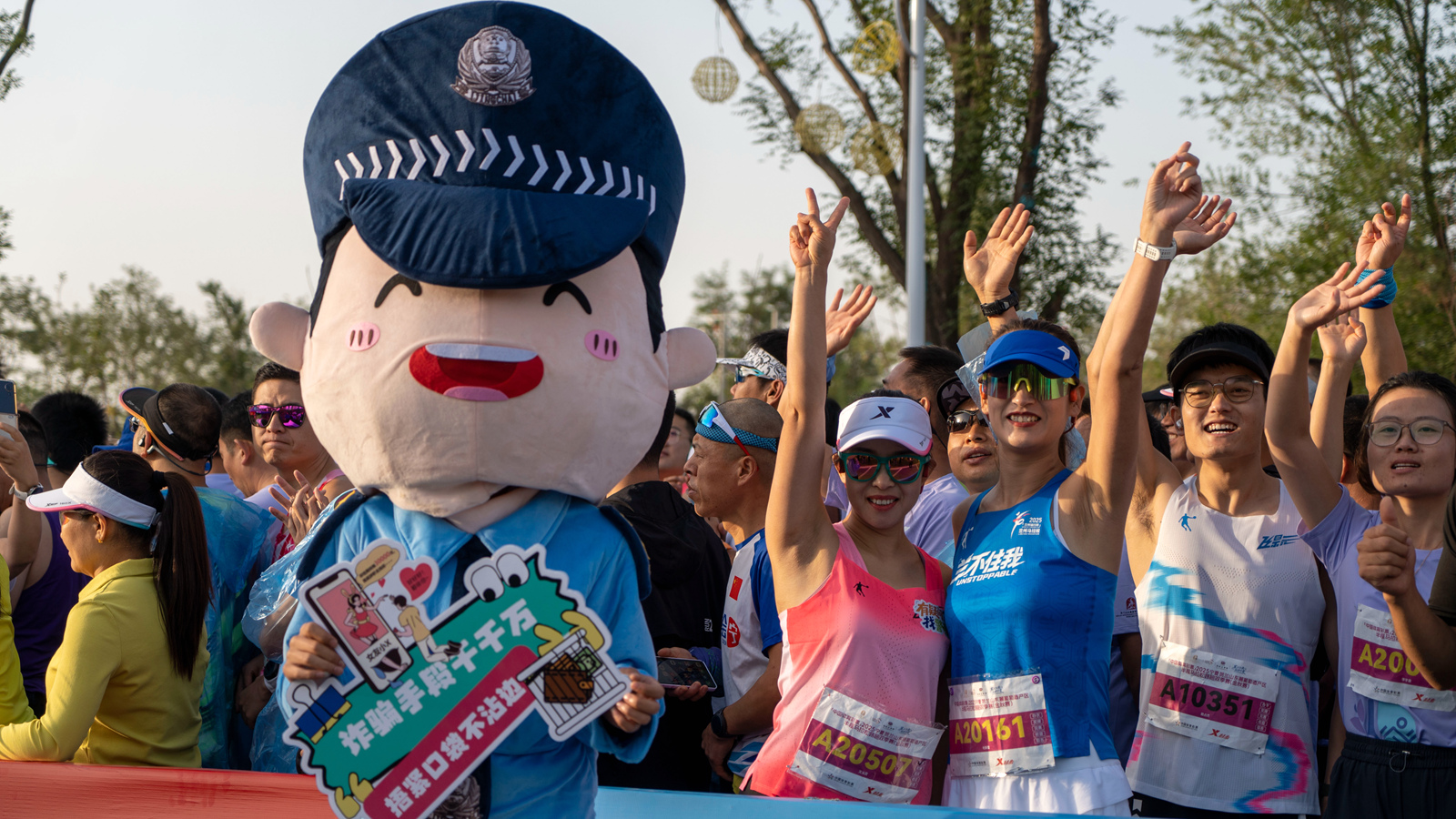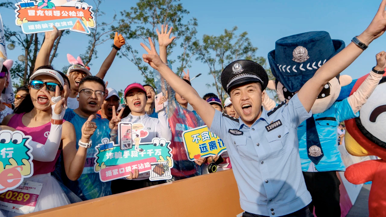 賽道沿途,20余處反詐提示牌化身“移動(dòng)安全站”,沿著賽道動(dòng)態(tài)展示反詐標(biāo)語。“防詐護(hù)跑、安心開跑”“跑贏馬拉松,更要跑贏詐騙”等幽默標(biāo)語與跑道計(jì)時(shí)芯片、卡通警察形象巧妙結(jié)合,為選手打造“跑一步、學(xué)一句”的沉浸式反詐體驗(yàn)。