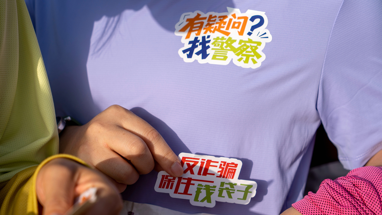 賽事當(dāng)日,4000余張“別讓騙子跑過你”主題貼畫在起跑區(qū)掀起一場(chǎng)熱烈的“反詐加油”浪潮。民警手持貼畫穿梭在人群中,熱情地將一張張色彩鮮艷、設(shè)計(jì)活潑的反詐貼畫輕輕貼在跑者們的參賽服上。