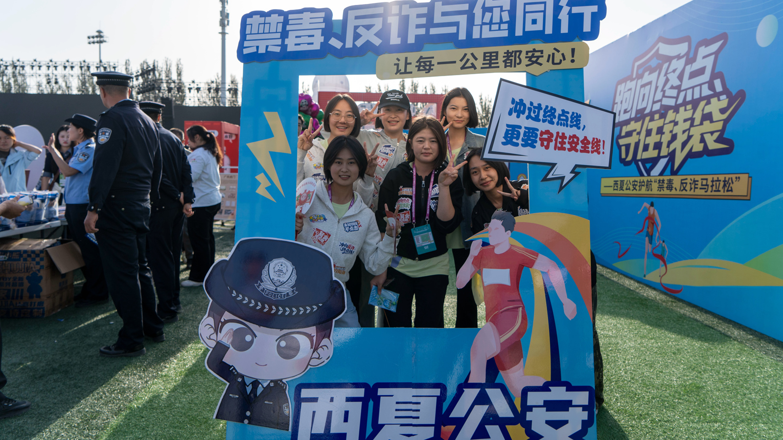 賽場(chǎng)終點(diǎn),西夏公安還精心設(shè)置“超級(jí)能量站”,布局知識(shí)轉(zhuǎn)盤、案例展示、簽名打卡、合影兌獎(jiǎng)四大功能分區(qū),讓反詐知識(shí)抵達(dá)馬拉松賽事“最后一米”。