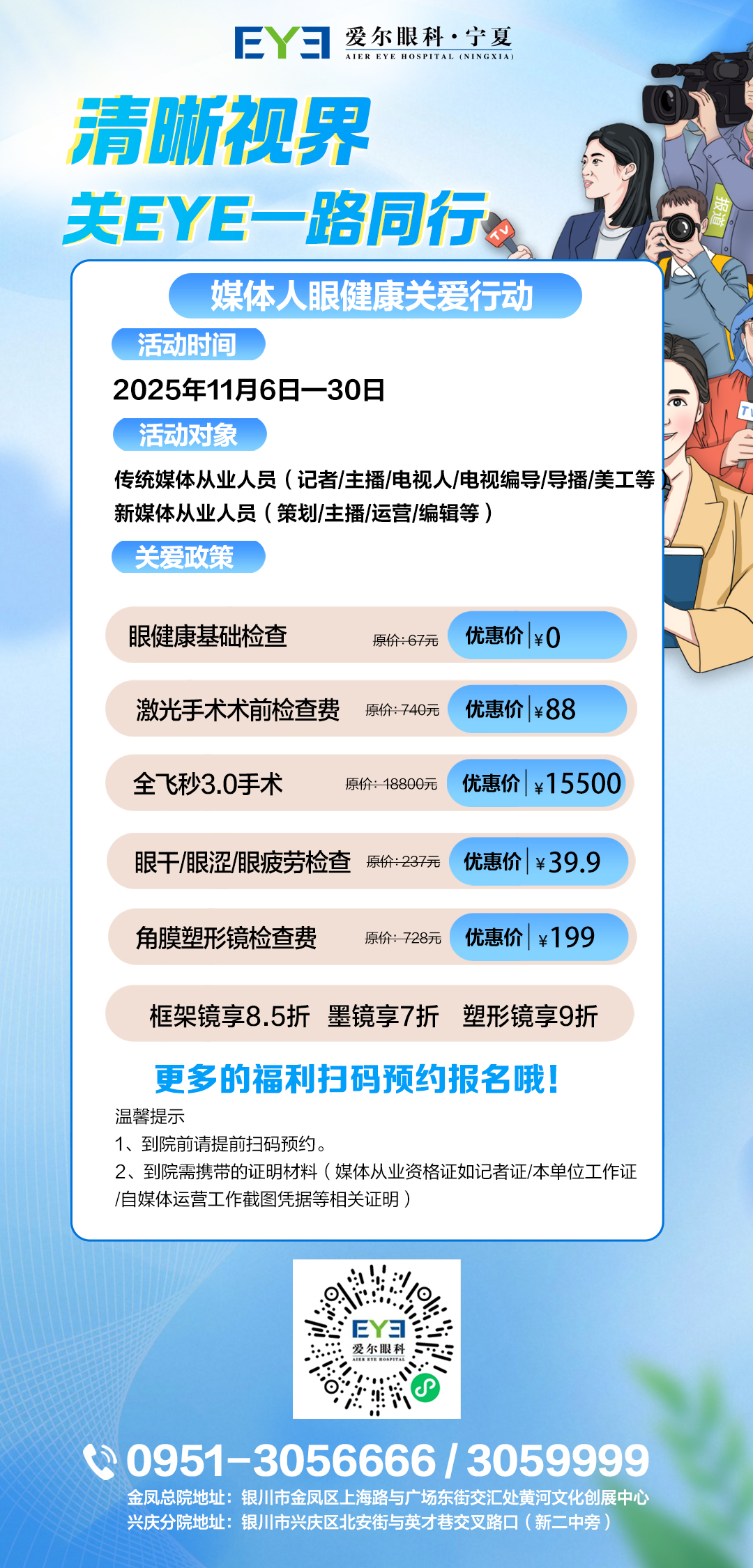 據(jù)了解,為了讓媒體人更好地了解自己的眼健康狀況,及時發(fā)現(xiàn)并治療眼部疾病,寧夏愛爾眼科醫(yī)院于11月6日-30日針對傳統(tǒng)媒體從業(yè)人員(記者、主播、電視人、電視編導、導播、美工等)、新媒體從業(yè)人員(策劃、主播、運營、編輯等)開展“清晰視界,關eye一路同行”媒體人眼健康關愛行動。憑媒體從業(yè)資格證如記者證、本單位工作證、自媒體運營等相關工作證明到院可享受眼健康檢查、近視手術、配鏡、干眼檢查及理療等專屬活動價格優(yōu)惠。(圖片由醫(yī)院提供)