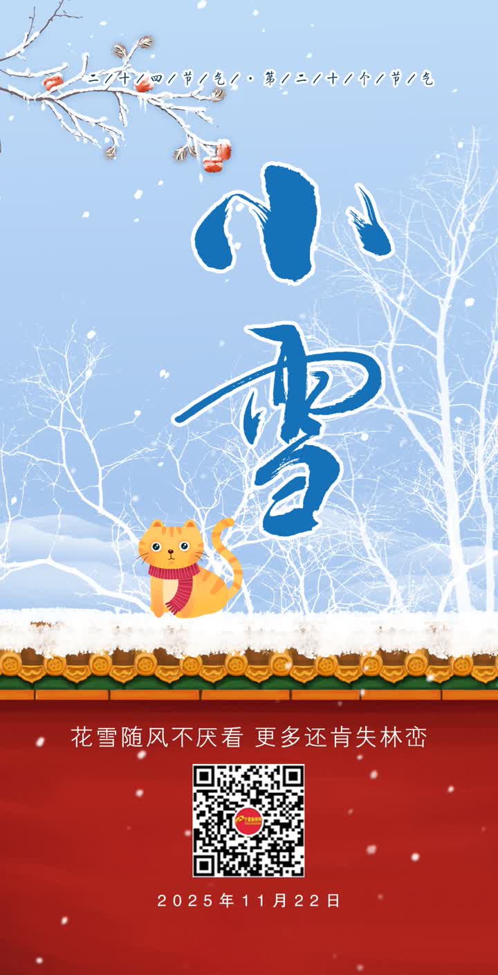 “小雪”是二十四節(jié)氣中的第二十個節(jié)氣,也是冬季的第二個節(jié)氣?!对铝钇呤蚣狻防镏v:“小雪,十月中雨下而為寒氣所薄,故凝而為雪,小者未盛之辭。”就是說“小雪”節(jié)氣到來之后,大氣中的水蒸氣遇到了寒冷的空氣就凝固為雪,這個“小”指的是沒有到達最盛大的樣子,就是“未盛之辭”。