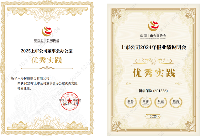 上市以來,新華保險持續(xù)優(yōu)化公司治理、信息披露和投資者管理工作,堅(jiān)持“專業(yè)、合規(guī)、服務(wù)”原則,不斷提升專業(yè)水準(zhǔn)和工作質(zhì)效。2025年,公司治理、信息披露和投資者關(guān)系管理工作更是聚焦公司戰(zhàn)略轉(zhuǎn)型和中心工作,在合規(guī)運(yùn)作基礎(chǔ)上著力提升工作效能,傳遞公司價值和傳播公司品牌,助力公司高質(zhì)量、高能級發(fā)展和投資價值的持續(xù)提升。2025年,公司治理持續(xù)完善,董事會運(yùn)作進(jìn)一步提質(zhì)增效;信息披露工作連續(xù)第十年榮獲上交所信息披露工作最高評價A(優(yōu)秀);投資者關(guān)系進(jìn)一步深化,公司價值贏得廣泛認(rèn)同。