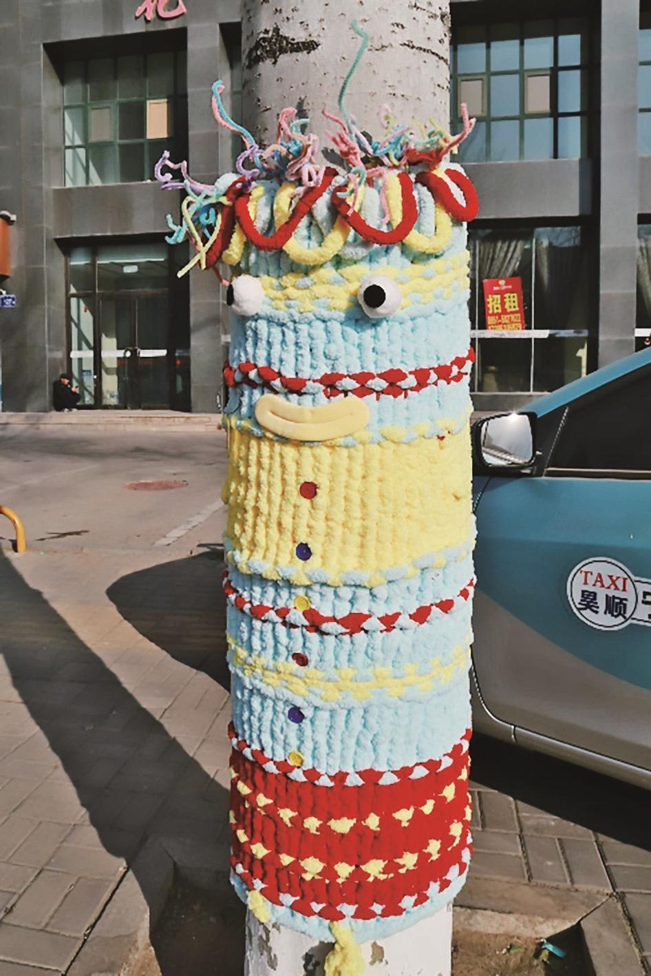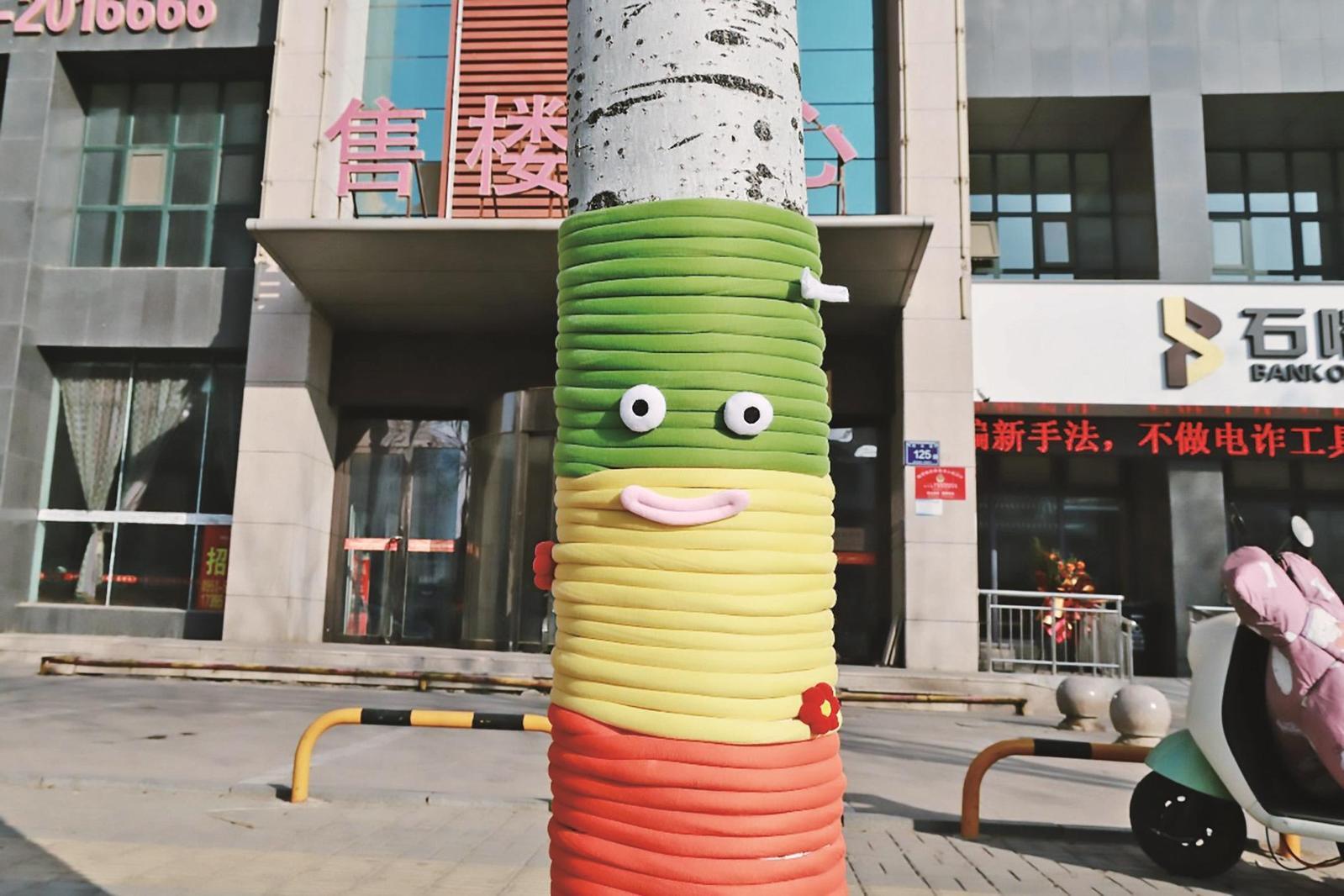 冬日里,當寒風染黃枝頭,當落葉鋪滿小徑,愛心人士用奇思妙想為銀川的樹木披上溫暖又別致的“毛衣”(12月15日攝)。