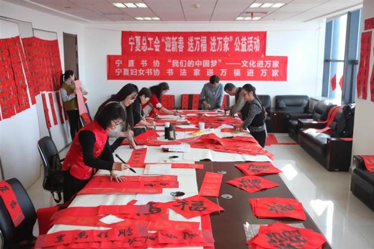 萬里晴空風(fēng)和煦,春風(fēng)送暖福臨門。1月14日下午,自治區(qū)總工會機關(guān)舉辦首場“迎新春 送萬福 進萬家”公益活動,有幸邀請到寧夏婦女書法家協(xié)會主席喬華以及趙萍、趙彥、蘇詠梅、何軍菁等6名書法家現(xiàn)場創(chuàng)作對聯(lián)等書法作品500份。一個個厚實飽滿的“?!弊?、一副副氣韻生動的春聯(lián),寄托著對新的一年美好的期盼和祝福,讓大家在感受喜慶的同時還體會到了中國書法的傳統(tǒng)文化魅力,濃濃的新年氣息撲面而來。