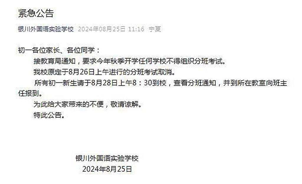 銀川外國(guó)語(yǔ)實(shí)驗(yàn)學(xué)校初一新生分班考試被緊急叫停