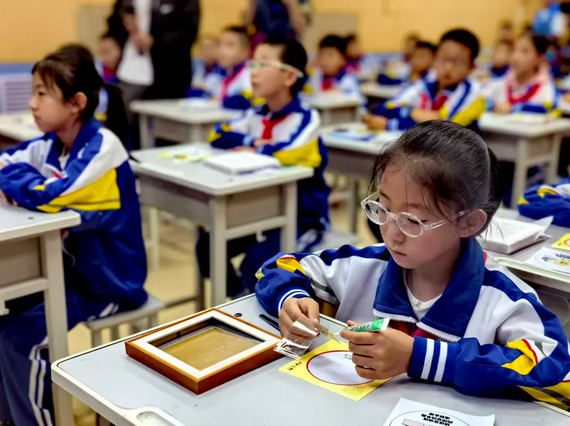 當(dāng)天下午,采訪團(tuán)抵達(dá)首站彭陽縣。圖為彭陽三小同學(xué)制作麥稈畫非遺法治文創(chuàng)作品。